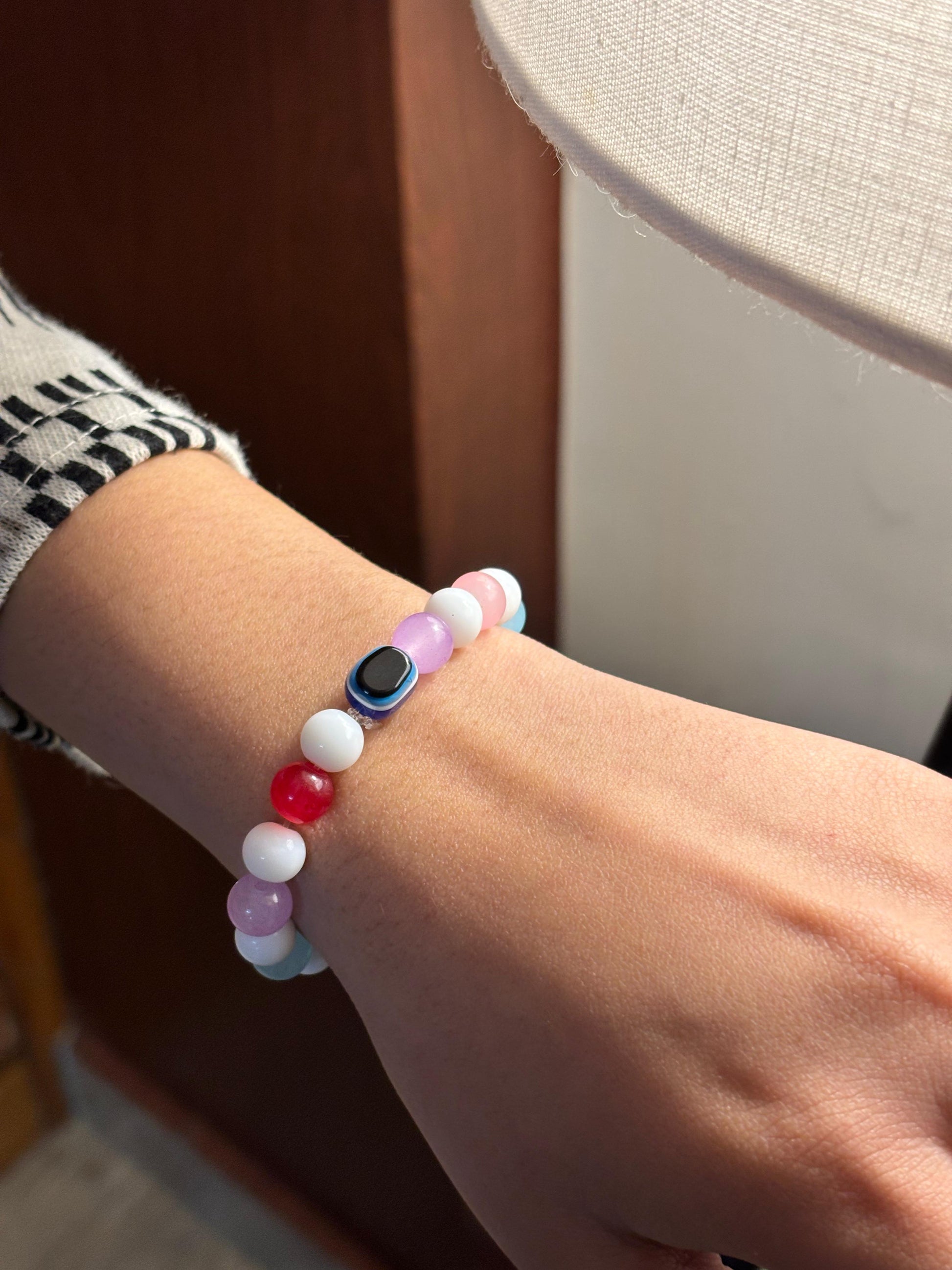 - Pastel multicolour evil eye bracelet – Elastic bracelet with soft pastel beads and a central evil eye charm.