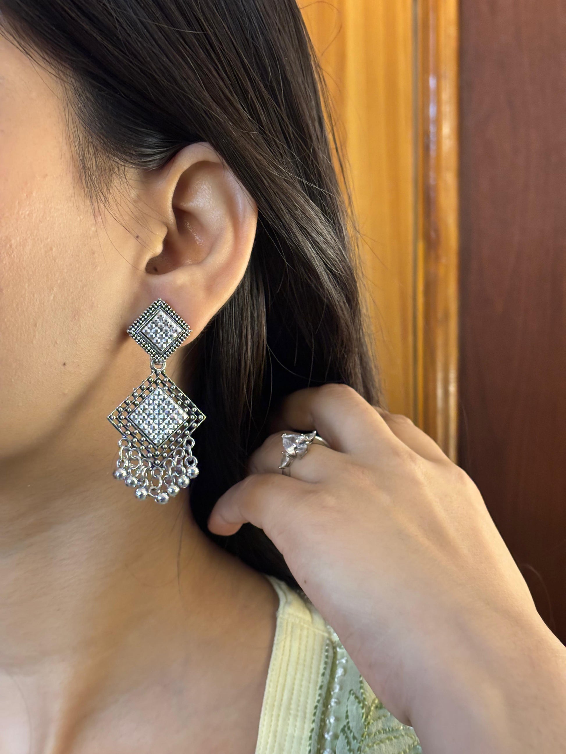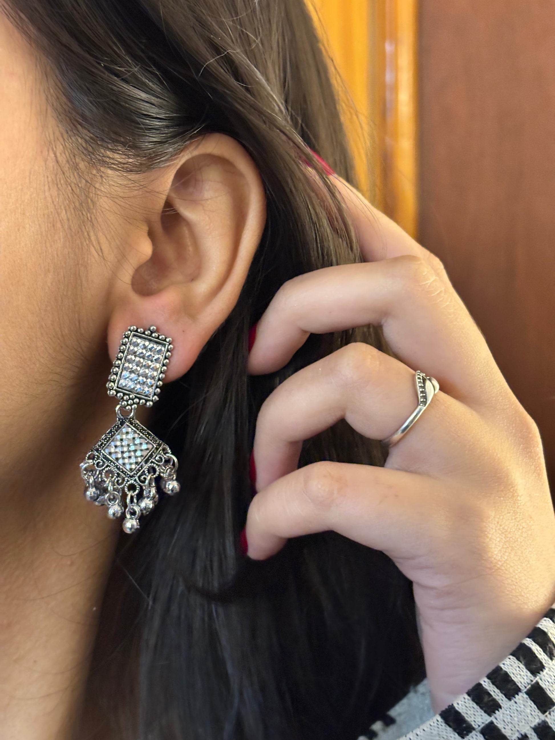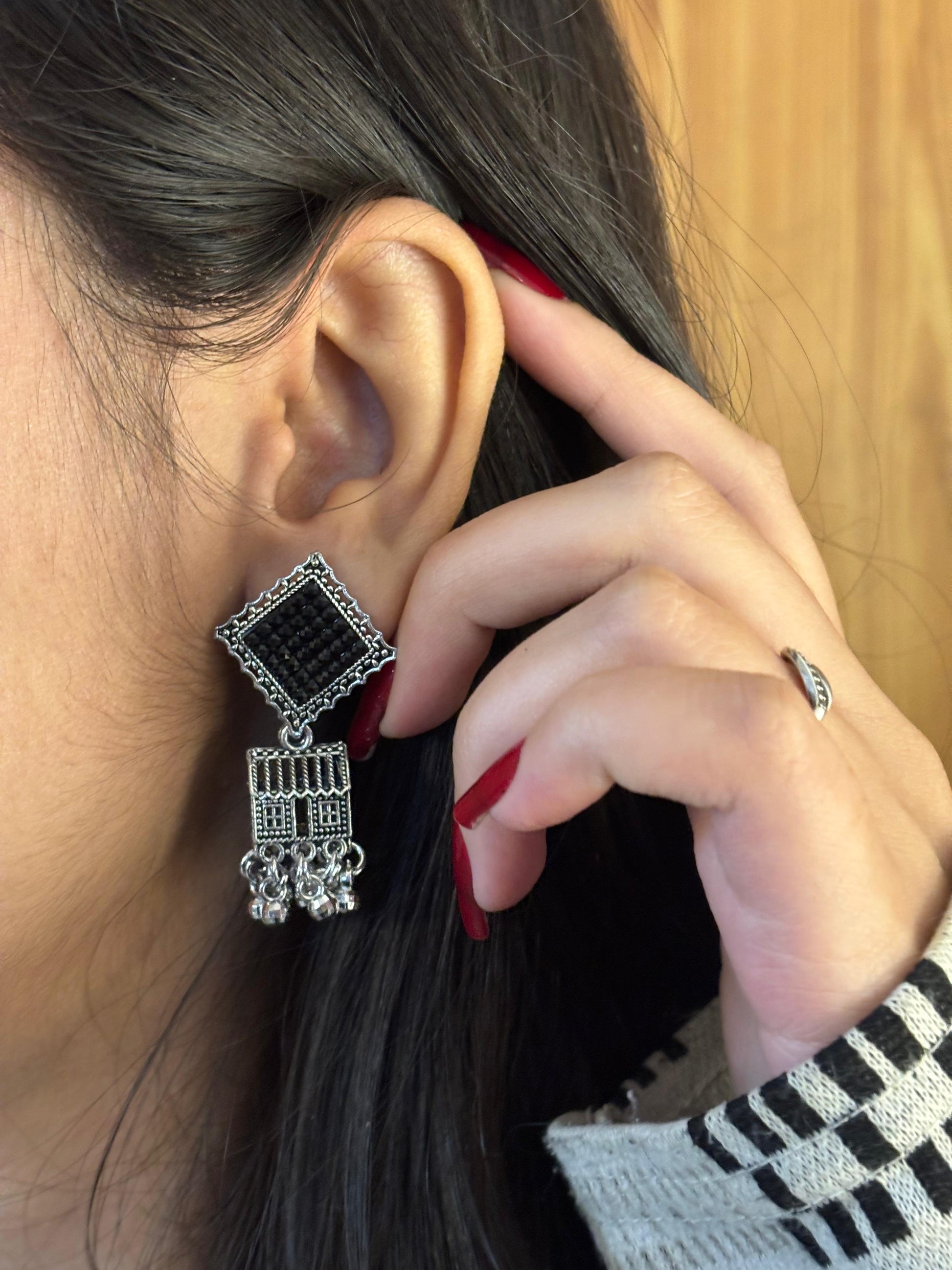 - Oxidised square jhumka earrings – Square oxidised stud with layered dangling bead elements.