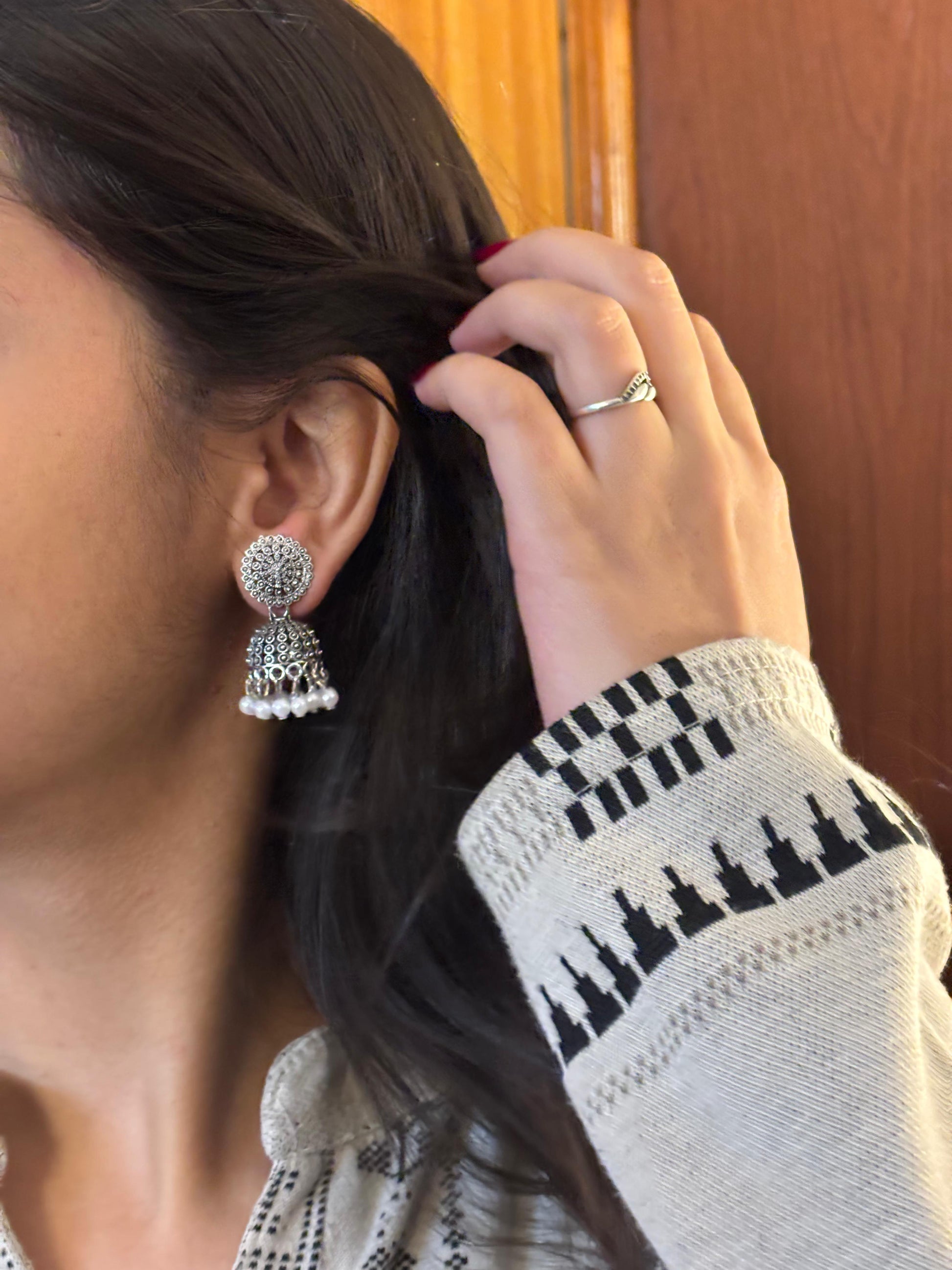 - Oxidised crescent jhumka earrings – Semi-circular oxidised design with hanging bead accents.